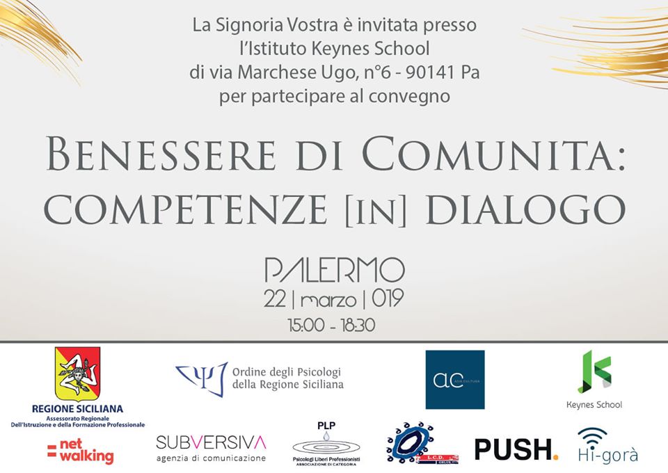 Si è svolto il 22 marzo 2019 a Palermo presso il Keynes Institute il seminario “Benessere (in) Comunità: Competenze in dialogo“, organizzato dall’associazione Asia Cultura, patrocinato dall’Assessorato Regionale dell’Istruzione e della Formazione Professionale e dall’Ordine degli Psicologi della Regione Sicilia, con la partecipazione di PLP Sicilia, Lega Contro la Droga ONLUS, Subversiva e Push.